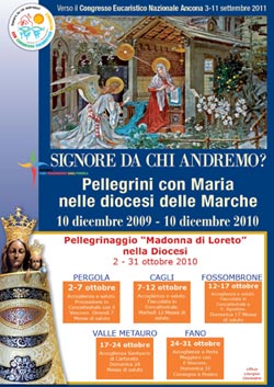 Dal 2 al 31 ottobre 2010 si terrà nella diocesi di Fano-Fossombrone-Cagli-Pergola il Pellegrinaggio “Madonna di Loreto”. La comunità diocesana guidata dal vescovo Armando Trasarti si preparerà così al Congresso Eucaristico Nazionale  (Ancona, 3-11 settembre 2011) dal titolo “Signore da chi andremo?”. Il pellegrinaggio “Madonna di Loreto” partirà da Pergola (2-7 ottobre 2010) con l’accoglienza e il saluto della comunità. Seguirà la processione in Concattedrale con il vescovo. Dal 7 al 12 ottobre poi si sposterà a Cagli mentre dal 12 al 17 ottobre a Fossombrone. A Valle Metauro, invece, il pellegrinaggio si svolgerà dal 17 al 24 ottobre. Qui la Madonna di Loreto sarà accolta nel Santuario di Cartoceto. L’ultima tappa sarà a Porta Maggiore, a Fano (24-31 ottobre 2010) con l’affidamento finale a Maria e la consegna del simulacro alla diocesi di Pesaro.