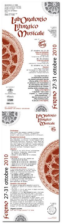Un “Laboratorio liturgico musicale” in preparazione al XXV Congresso Eucaristico nazionale che si terrà nell’Arcidiocesi di Ancona-Osimo. Lo organizzano l’Ufficio liturgico delll’Arcidiocesi di Fermo, l’Azione cattolica diocesana di Fermo con il patrocinio del Comune di Fermo. Saranno cinque giorni (“7-31 ottobre 2010) di laboratorio in cui “si preparerà la Messa della Concordia, scritta per i diversi momenti della Celebrazione Eucaristica” spiegano i promotori, ispirata al rituale “messa per una riunione spirituale o pastorale”. I testi e le musiche sono stati composti da Jocelyn Belamide, Nancy Uelmen, Valerio Ciprì, in collaborazione con Mons. Pierangelo Sequeri. Tra gli obiettivi quello di “offire ai cori della Diocesi un’occasione di incontro, formazione, condivisione del lavoro e di preghiera e animare la Santa Messa del 31 ottobre 2010