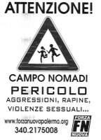 Forza nuova e manifesti razzisti Forza Nuova, il movimento guidato da Roberto Fiore, l'altro ieri ha tappezzato il viale del Fante, la strada che costeggia lo stadio e il “campo nomadi” di Palermo, con manifesti con il segnale di pericolo e la scritta «Attenzione campo nomadi. Aggressioni, rapine e violenze sessuali».
