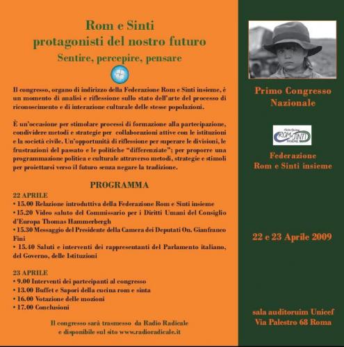 La Federazione Rom e Sinti, organismo politico delle minoranze Rom e Sinte, organizza a Roma in Via Palestro n. 68, sala convegni UNICEF, mercoledì 22 Aprile e giovedì 23 Aprile 2009 il primo congresso nazionale “Rom e Sinti, protagonisti del nostro futuro. Sentire, percepire, pensare” Promosso per la prima volta in Italia, il congresso si pone come organo di indirizzo della federazione e quale momento di analisi e riflessione sullo stato dell’arte del processo di riconoscimento e di interazione culturale con Rom e Sinti, con l’obiettivo di aprire un confronto per stimolare i processi di formazione alla partecipazione (capacity building), per condividere strategie e metodologie di collaborazione attiva con il livello istituzionale e la società civile.