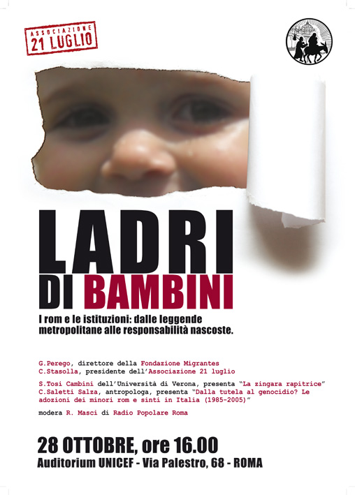 La Fondazione Migrantes e l'Associazione 21 luglio vi invitano a partecipare al convegno "Ladri di bambini. I rom e le istituzioni: dalle leggende metropolitane alle responsabilità nascoste" che si terrà venerdi 28 ottobre alle ore 16,00 presso l'Auditorium Unicef a Roma, in via Palestro 68.