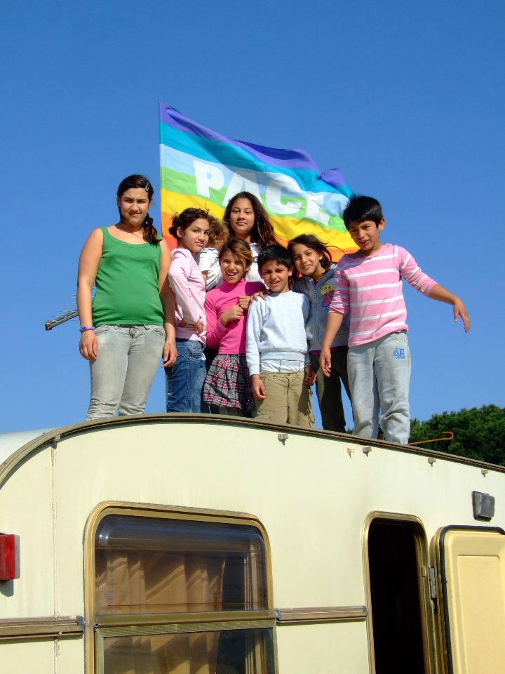La bandiera della Pace sul tetto della roulotte "In piedi, costruttori di pace, rimettiamo le bandiere della pace ai nostri balconi e impegniamoci per realizzare questo Sogno" .(p.Alex Zanotelli)