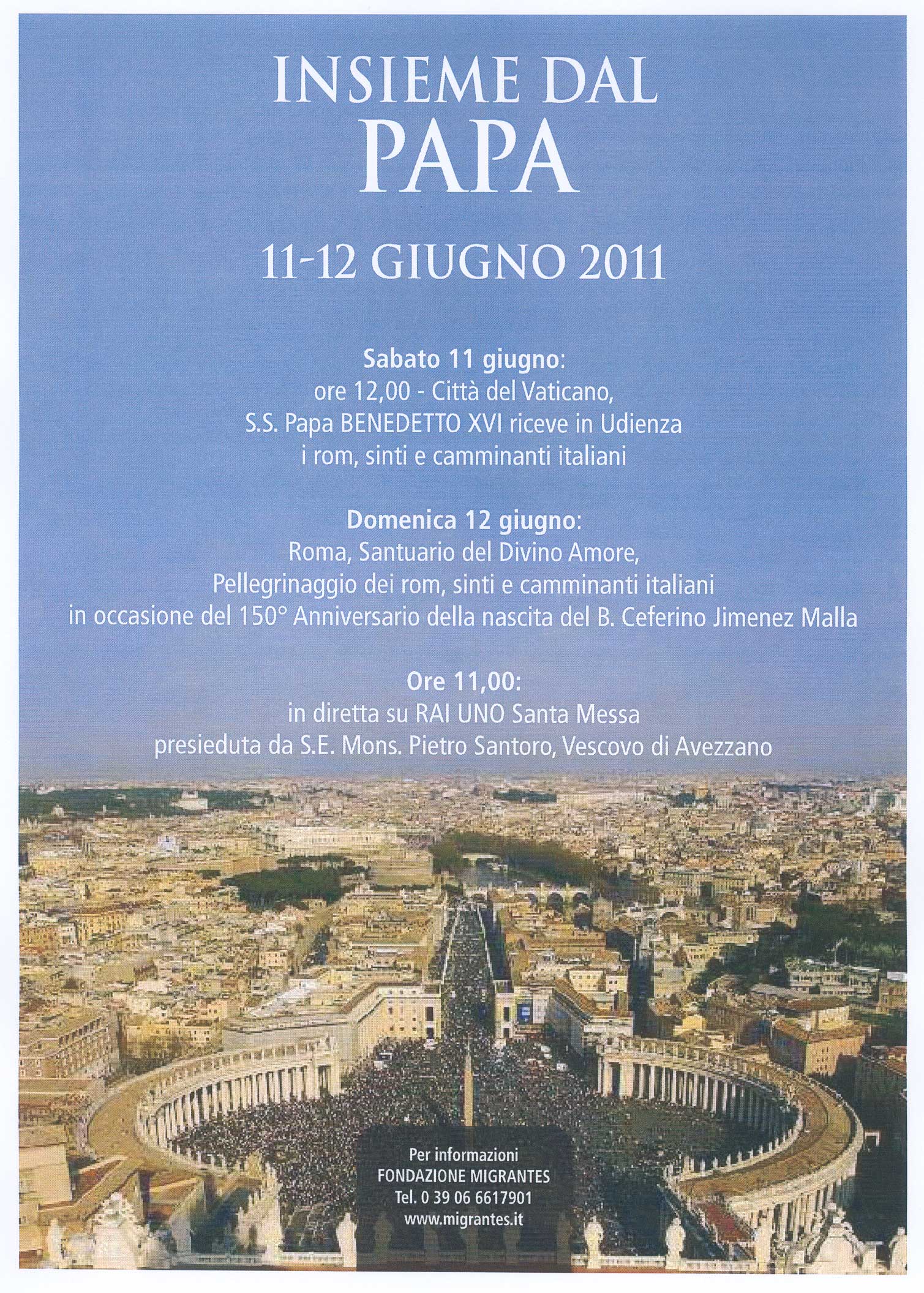 Sabato 11 giugno: ore 12,00 - Città del Vaticano, S.S.Papa Benedetto XVI riceve in Udienza i rom, i sinti e camminanti italiani
