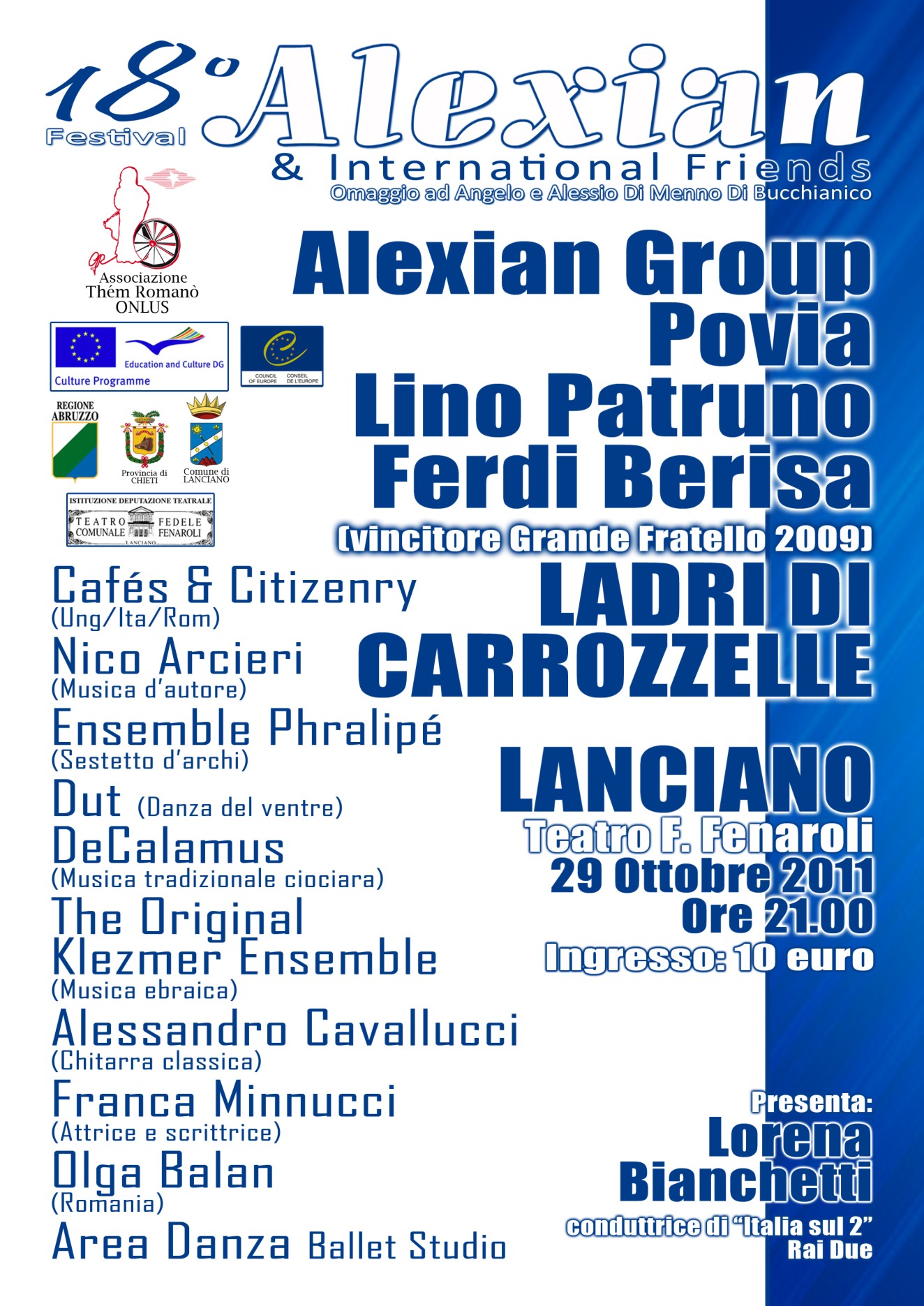 Ritorna ad ottobre uno degli appuntamenti musicali più importanti e seguiti del panorama nazionale: l’Alexian and International Friends. L’evento artistico giunto alla sua 18° edizione ha visto negli anni la partecipazione di artisti e personaggi di fama nazionale ed internazionale del calibro di: Paco Suarez, Sageer Khan, Miriam Meghnagi, Moni Ovadia, Francesco Baccini, i Tazenda, Eugenio Bennato, Paolo Brosio, Alesandra Canale, Gianni de Berardinis, Dario Vergassola, Enrico Beruschi, Rossana Casale, Audio 2, i Jalisse, Cristiano Malgioglio, Pino Insegno, Linda, Furio Colombo, David Sassoli, i Baraonna e tantissimi altri. Il festival si terrà sabato 29 ottobre 2011 presso il Teatro Fedele Fenaroli di Lanciano (Chieti) e ospiterà anche quest’anno importanti personaggi che artisticamente interagiranno con Alexian Santino Spinelli. La formazione dell’artista abruzzese prevede anche la presenza dei suoi figli: Gennaro Spinelli alle percussioni, Giulia Spinelli al violoncello ed Evedise Spinelli all’arpa, completano il gruppo Manuel Virtù alla chitarra e al laud, Antonio Ranieri alla chitarra, Silvia Faugno alla voce e Luciano Pannese al contrabasso. Confermata la presenza di un’icona del jazz nazionale come Lino Patruno, del noto gruppo musicale Ladri di Carrozzelle e dei direttori d’orchestra Sergio Rendine e Luciano Di Giandomenico a cui andranno i Premi Attilio D’Amico 2011 e Angelo e Alessio Di Menno Di Bucchianico 2001 a cui il Festival è dedicato, sarà presente anche la poetessa sinta Paula Shöps, vincitrice del premio alla carriera.