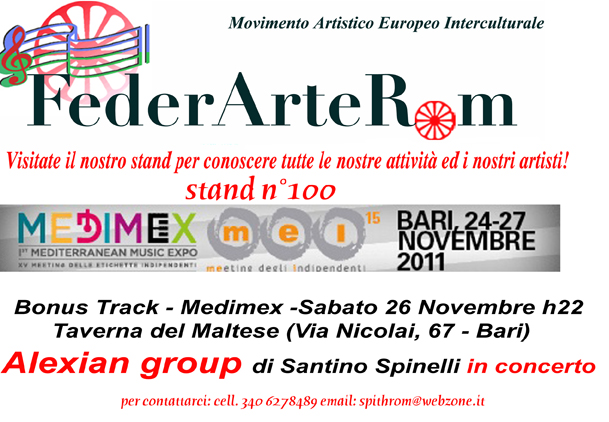 21.11.2011 La FederArteRom, Movimento Artistico Interculturale, sarà presente al MEDIMEX di Bari dal 24 al 27 novembre allo stand n° 100. Visitando lo stand sarà possibile conoscere le nostre attività e i nostri artisti. Sabato 26 novembre nell'ambito di BONUS TRACK -MEDIMEX l'Alexian group di Santino Spinelli sarà in concerto alle h 22 presso la Taverna del Maltese, in via Nicolai, 57 a Bari .Vi aspettiamo numerosi per contattarci: cell. 340 6278489, email: spithrom@webzone.it