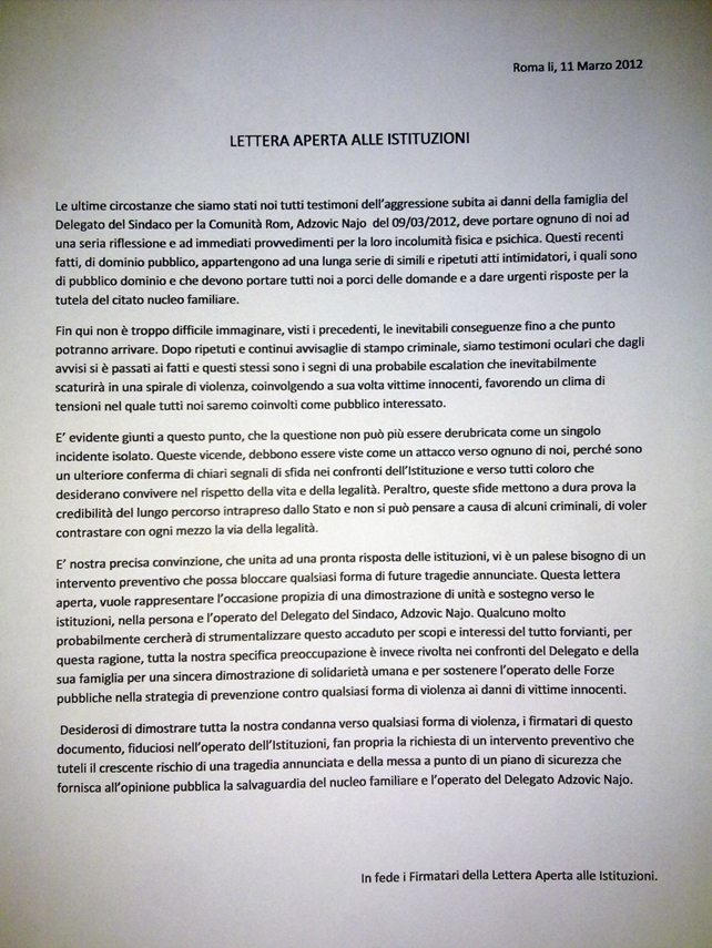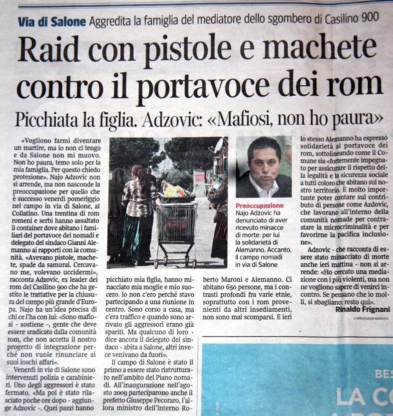15 marzo 2012 Roma - “Testimoniare vicinanza e solidarietà”, oltre che “stima e amicizia, a Najo Adzovic, delegato del Sindaco di Roma per la comunità rom, viene espressa da don Paolo Lo Judice. I familiari di Adzovic hanno subito, nei giorni scorsi, nella baracca in cui vivono, alcuni atti intimidatori. Najo, con “grande zelo, ha dimostrato passione e disponibilità ad affrontare tutte le situazioni, anche più difficili e rischiose, spiega don Lo Judice. “Le tensioni all’interno dei campi (oltre questo spiacevolissimo episodio) sono molto alte; c’è un clima di aggressività degli uni contro gli altri ma, in alcuni casi, anche nei confronti di noi volontari, accusati di aiutare uno invece che un altro, di favorire le richieste (non vere, a giudizio di alcuni) di alcune famiglie invece che di altre”, spiega ancora il sacerdote: “tutto questo non rende facile il nostro semplice contatto con i rom: ma non ci arrendiamo. Crediamo che ci siano all’interno di questo popolo tante persone, uomini, donne, giovani (e anche bambini) che desiderano sinceramente uscire da queste situazioni di degrado. Se anche ce ne fosse una di famiglia così dovremmo andare avanti: ma per fortuna non ce n’è una sola”.