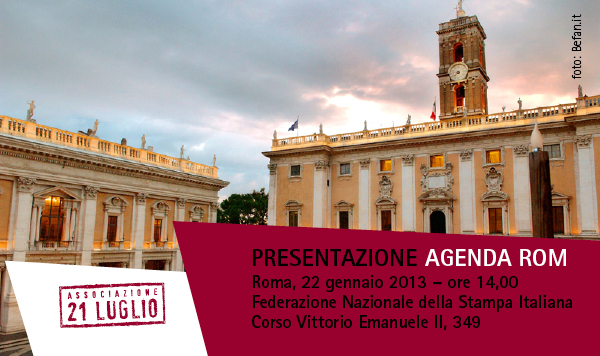 18 gennaio 2013 Martedi 22 gennaio alle ore 14,00 a Roma in Corso Vittorio Emanuele II, 359 presso la Federazione Nazionale della Stampa Italiana l’Associazione 21 luglio presenta l’AGENDA ROM.